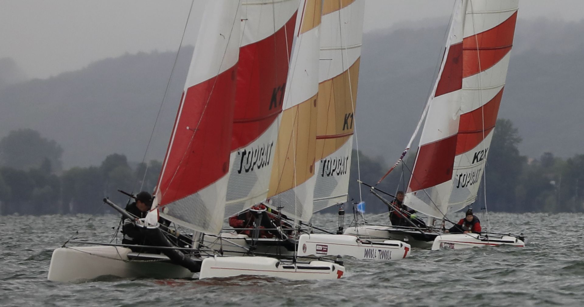Insbesondere die Teilnehmer der Topcat IDB, die bereits am Freitag starten wollten, dieses Unterfangen jedoch mangels Windes nicht umsetzen konnten, hofften auf konstant segelbare Bedingungen am Wochenende. Es kam anders. Winddreher bis zu 180 Grad, auch gerne mit Flauten kombiniert zwangen die Wettfahrtleitung immer wieder zu Abbrüchen und Verlegung der Bahnen. Es schien, dass diejenigen Segler im Vorteil sein würden, die am besten leichte Windstreiche und Dreher erahnten. Als jedoch am Sonntag eine Flaute binnen weniger Minuten in einen veritablen Starkwind mit Böen bis zu 28 Knoten umschlug, zeigte sich in der vorletzten Wettfahrt, wer auch Starkwind kann. Die letzte Wettfahrt wurde angesichts diverser Kenterungen und der einsetzenden Flucht etlicher Segler in den sicheren Hafen aus Sicherheitsgründen abgebrochen.